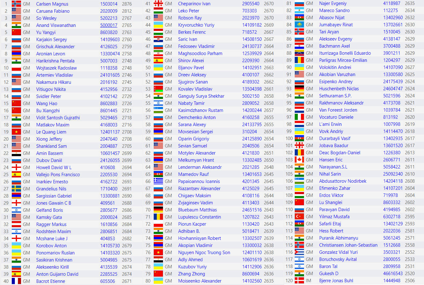 El plantel de jugadores no podría ser más espectacular, además de Magnus Carlsen y Fabiano Caruana, cuenta con 19 jugadores que superan los 2700 y otros 89 que superan los 2600, con un total de 119 grandes maestros. Entre la ausencias podemos destacar a Ding Liren, Maxime Vachier-Lagrave, Anish Giri, Ian Nepomniachtchi, Shakhriyar Mamedyarov, Teimour Radjabov, Leinier Dominguez, Vladimir Kramnik, Richard Rapport, Dmitry Andreikin, Veselin Topalov y David Navara.